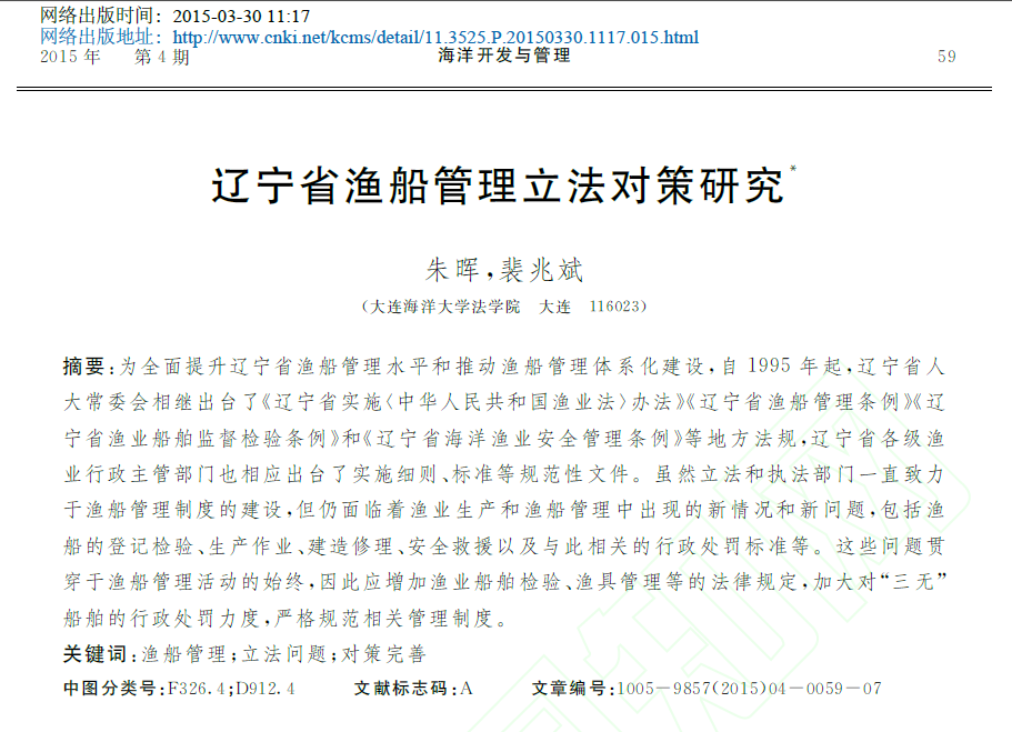 【校园喜报】公司朱晖等撰写的论文《辽宁省渔船管理立法对策研究》在《海洋开发与管理》杂志2015年第4期发表