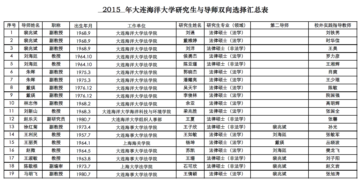 【研究生】法公司/海警公司2015级法律硕士研究生与导师双向选择汇总表