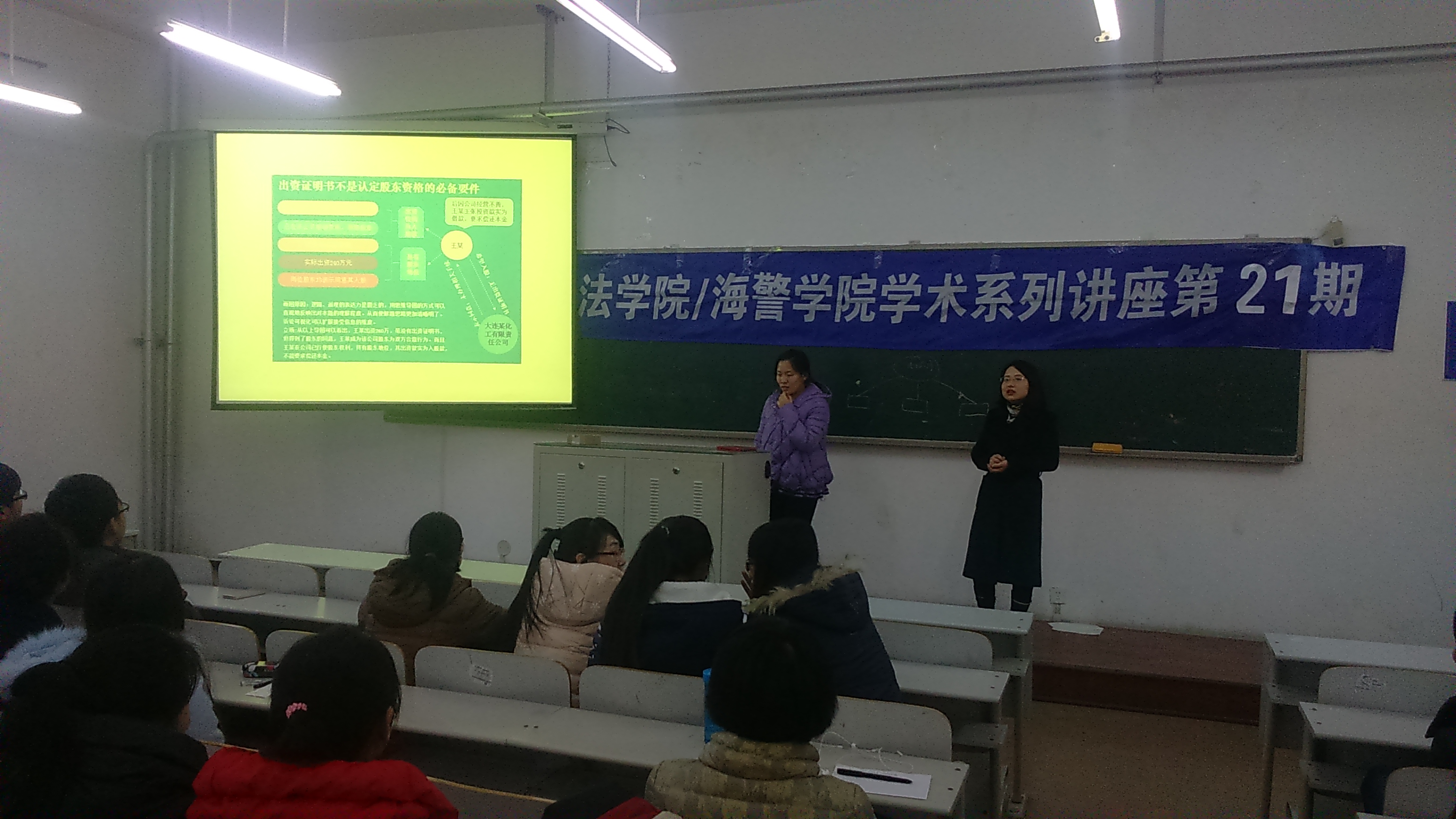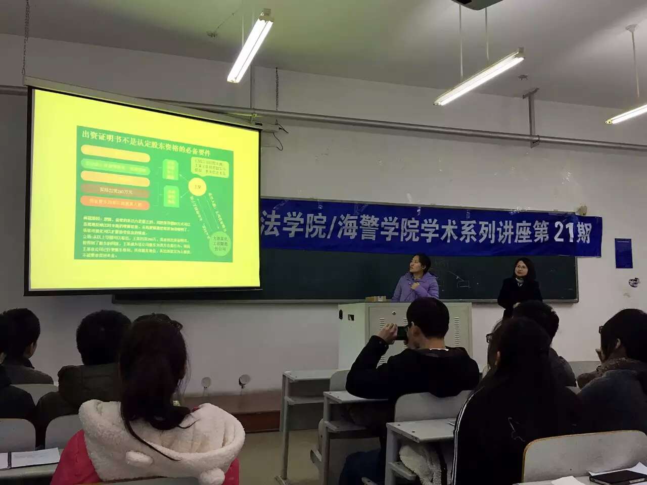 法公司(海警公司)“走向深蓝”学术系列讲座第21期于2015年12月18日下午在黄海校区獐子岛教学楼110教室举办。参加人员包括法学专业2013级、2014级本科生,法律硕士2015级员工以及法学教研室教师。此次讲座主题为《诉讼可视化表达:法律图表制作实务》,主讲人陈敏律师是辽宁智库律师事务所资深律师,也是公司法律硕士校外实践指导老师。陈敏律师在民商法、合同法、公司法方面都有着丰富的实践经验,曾为东北财经大学法公司研究生讲授法律实践课程。