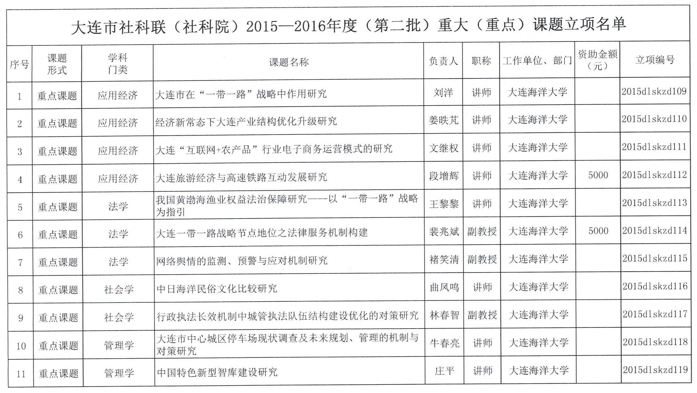 日前,大连市社科联下发了《关于印发2015-2016年度(第二批)重大(重点)课题立项名单的通知》,本次,市社科联共批准了165项重大(重点)课题立项,公司共获批11项重点课题,其中公司教师申报的4项课题获批重点课题立项,具体名单如下: