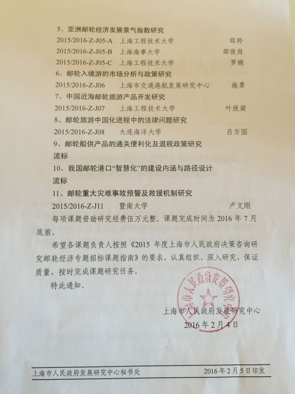 公司教师吕方园,裴兆斌,刘臣,范英梅,孙岑等老师联合申请了上海市政府咨询决策课题:邮轮旅游中国化进程中的法律问题研究,并获立项。立项编号2015/2016-Z-J08。课题资助经费5万元。