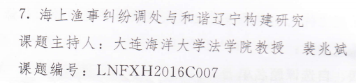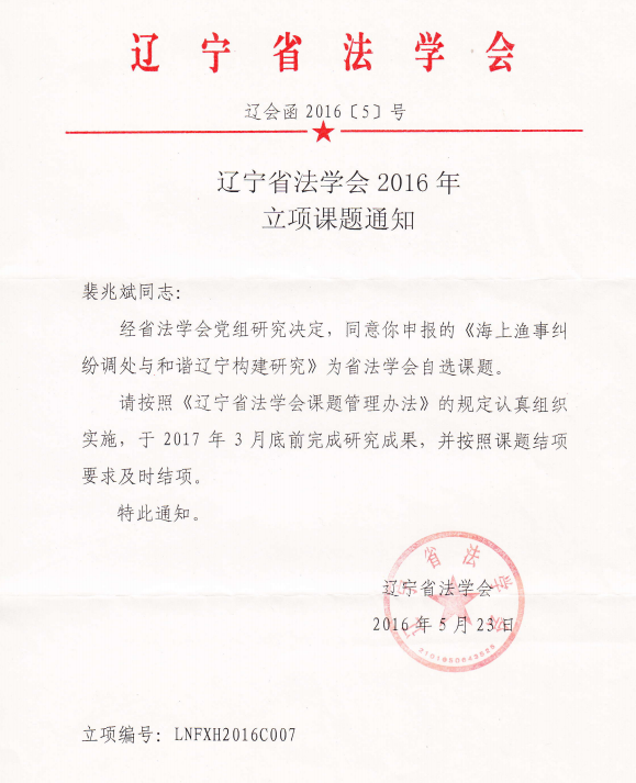 近日,辽宁省法学会公布了2016年度第一批立项课题,公司经理裴兆斌申报的 《海上渔事纠纷调处与和谐辽宁构建研究》和副经理戴瑛申报的《国际旅游视野下长海县港口规制法律问题研究》获批为省法学会自选课题。