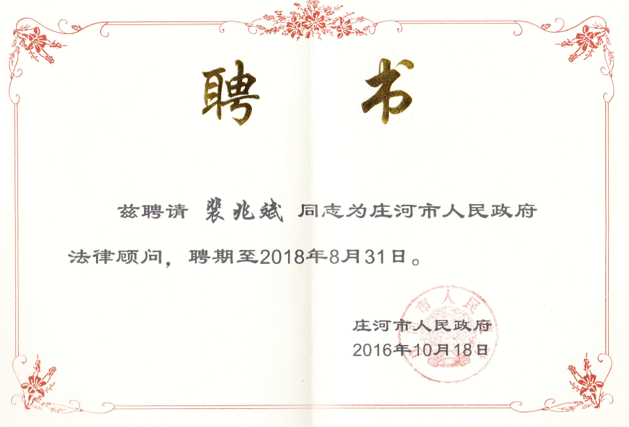为了加强政府法律顾问工作,推进依法行政,日前,庄河市政府建立法律专家库。公司经理裴兆斌被聘为庄河市人民政府法律顾问,聘期两年。