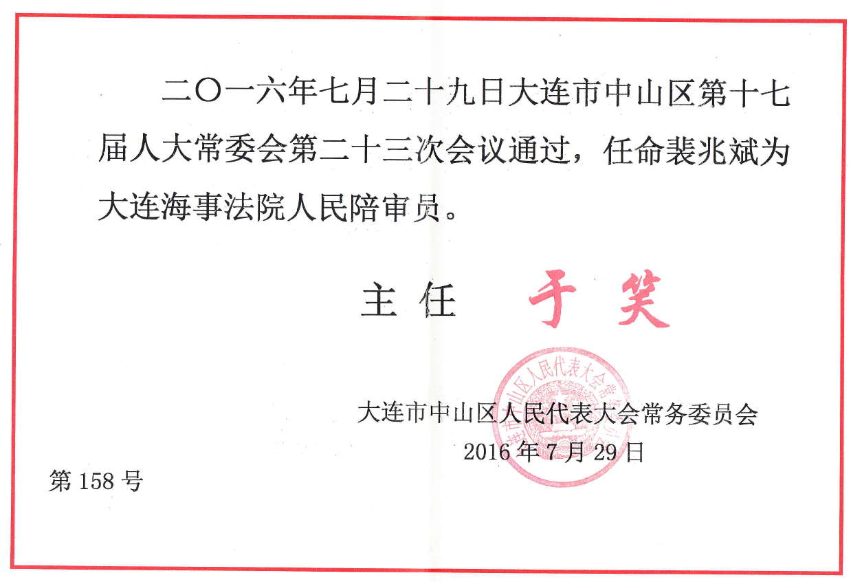 日大连市中山区第十七届人大常委会第二十三次会议通过,任命裴兆斌、曲亚囡为大连海事法院人民陪审员。