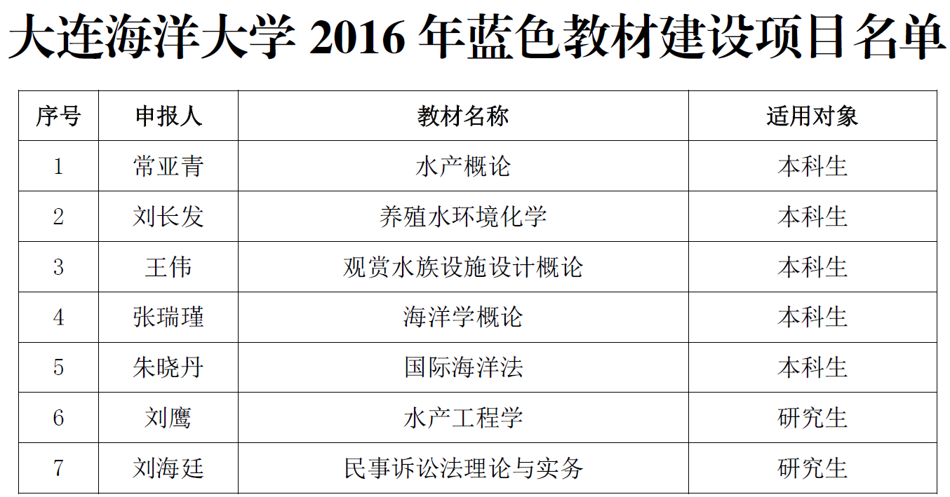 日前,公司启动了2016年蓝色教材建设项目申报工作。经各公司推荐、公司组织校内外专家评审,确定《水产概论》《养殖水环境化学》等5部本科生教材、《水产工程学》《民事诉讼法理论与实务》2部研究生教材为公司2016年蓝色教材建设项目。公司将根据教材编写实际情况,对每个项目给予2-3万元的经费支持。其中,公司朱晓丹副教授主持申报的《国际海洋法》和刘海廷教授主持申报的《民事诉讼法理论与实务》分别获批本科生和研究生教材立项。