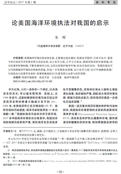法公司(海警公司)朱晖副经理、副教授以第一作者在《法学杂志》2017年第1期发表题为“论美国海洋环境执法对我国的启示”的文章。文章分析了美国海洋环境管理的行政执法措施和非强制措施。