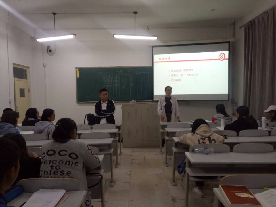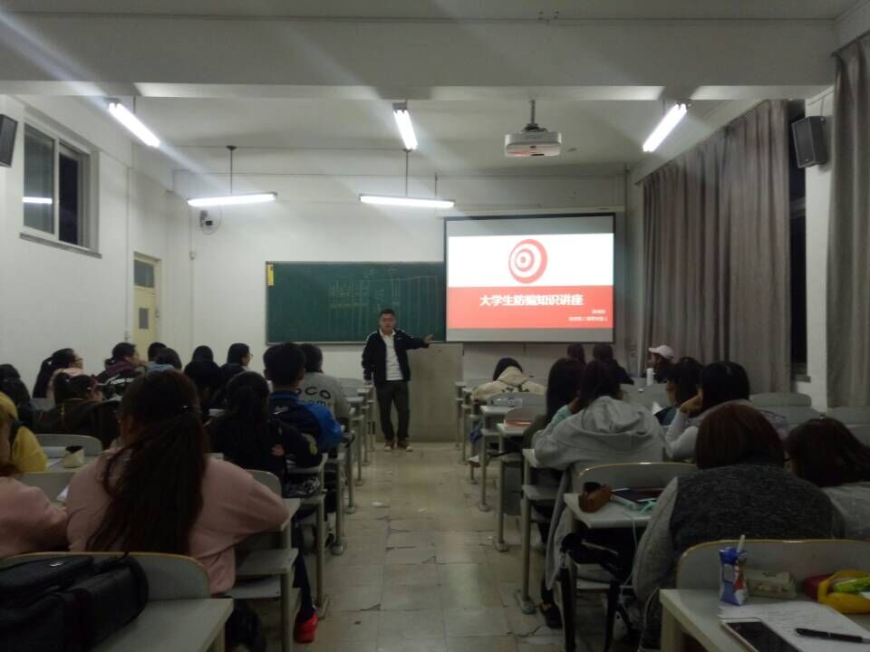 2017年10月17日晚,法公司(海警公司)于二教自习室组织大一新生举办了以“增强防电信诈骗意识”为主题的知识讲座。团委书记郭昕黎老师和院社联主席徐鸿浩作为主讲人分别对同学们进行了防骗意识宣传。