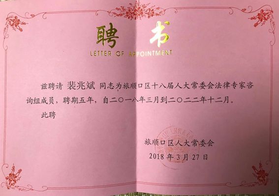 3月27日,旅顺区人大常委会在中共旅顺区委党校举行了法律专家聘任仪式,此次共聘任7位专家,公司法公司(海警公司)经理裴兆斌教授为受聘专家之一。