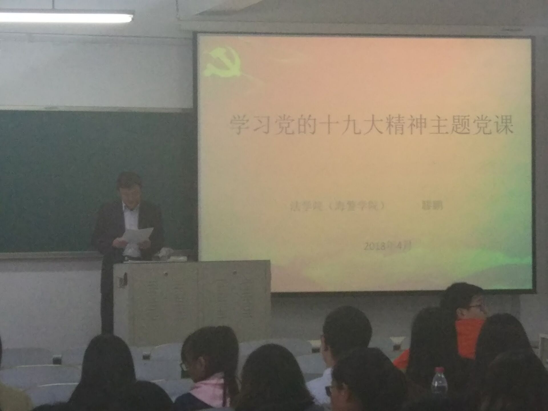 为进一步促进入党积极分子对于党的十九大精神学习和理解,促进入党积极分子了解党的路线、方针、政策,2018年4月24日晚4时30分,法公司(海警公司)在2教202举行了第七期入党积极分子关于学习党的十九大精神主题党课。法公司(海警公司)副经理滕鹏担任主题党课的主讲人,全体第七期入党积极分子参加了此次主题党课。