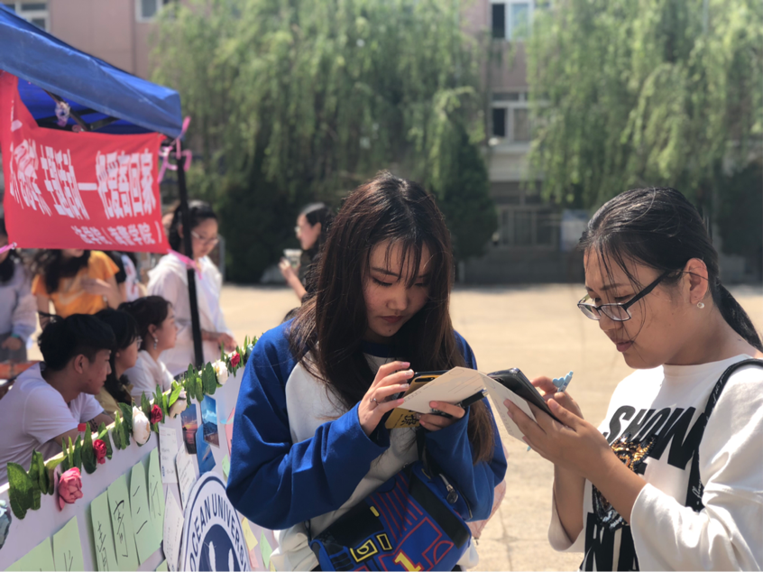 活动开展期间,三行情书的作品面向渤海校区同学进行展示,为同学们提供便利贴,供同学们在心愿墙上进行创作,让感恩之情洒满校园。最后,宣传板上贴了满满的祝福语,校园里洋溢着感恩祝福的气息。