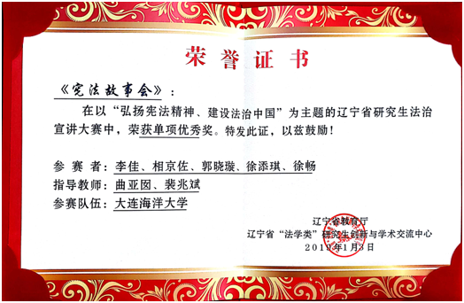 2018年11月25日下午,由辽宁省教育厅、辽宁省“法学类”研究生创新与学术交流中心承办的辽宁省研究生法治宣讲大赛在辽宁大学成功举行。本次大赛的主题是弘扬宪法精神、建设法治中国。包括辽宁大学、大连海事大学、东北财经大学、沈阳师范大学、中国刑警公司、沈阳工业大学、渤海大学、365英国上市公司、辽宁科技大学在内的9所来自辽宁省内具备法学类硕士学位授权点的高校参加了本次大赛。公司法公司(海警公司)研究生代表队获得单项优秀奖。