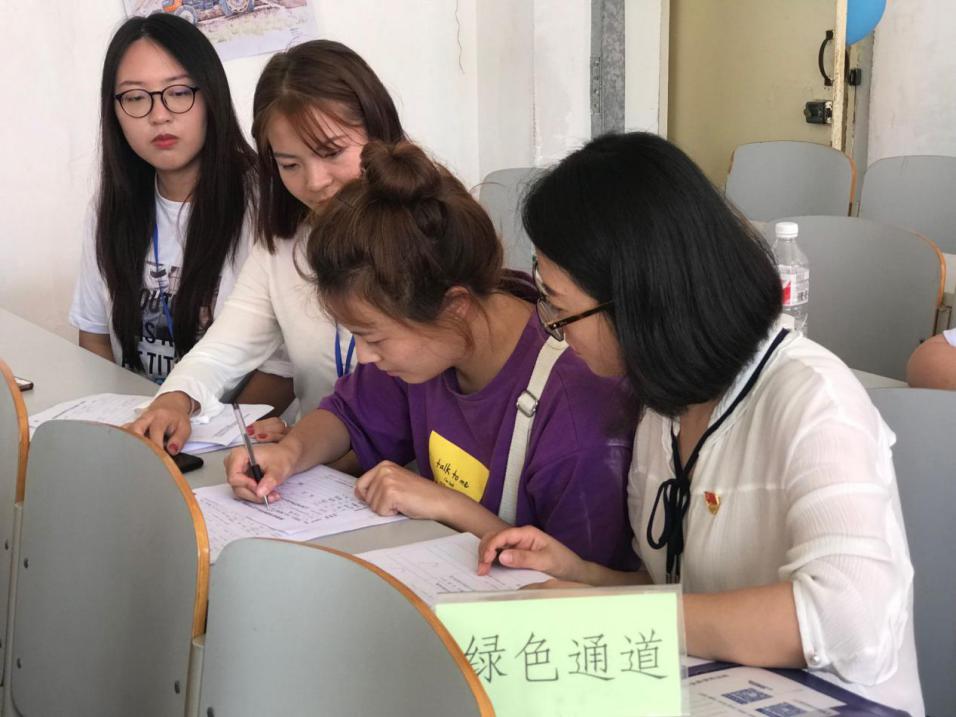 (图为团委书记郭昕黎老师指导19级新生填写绿色通道信息)