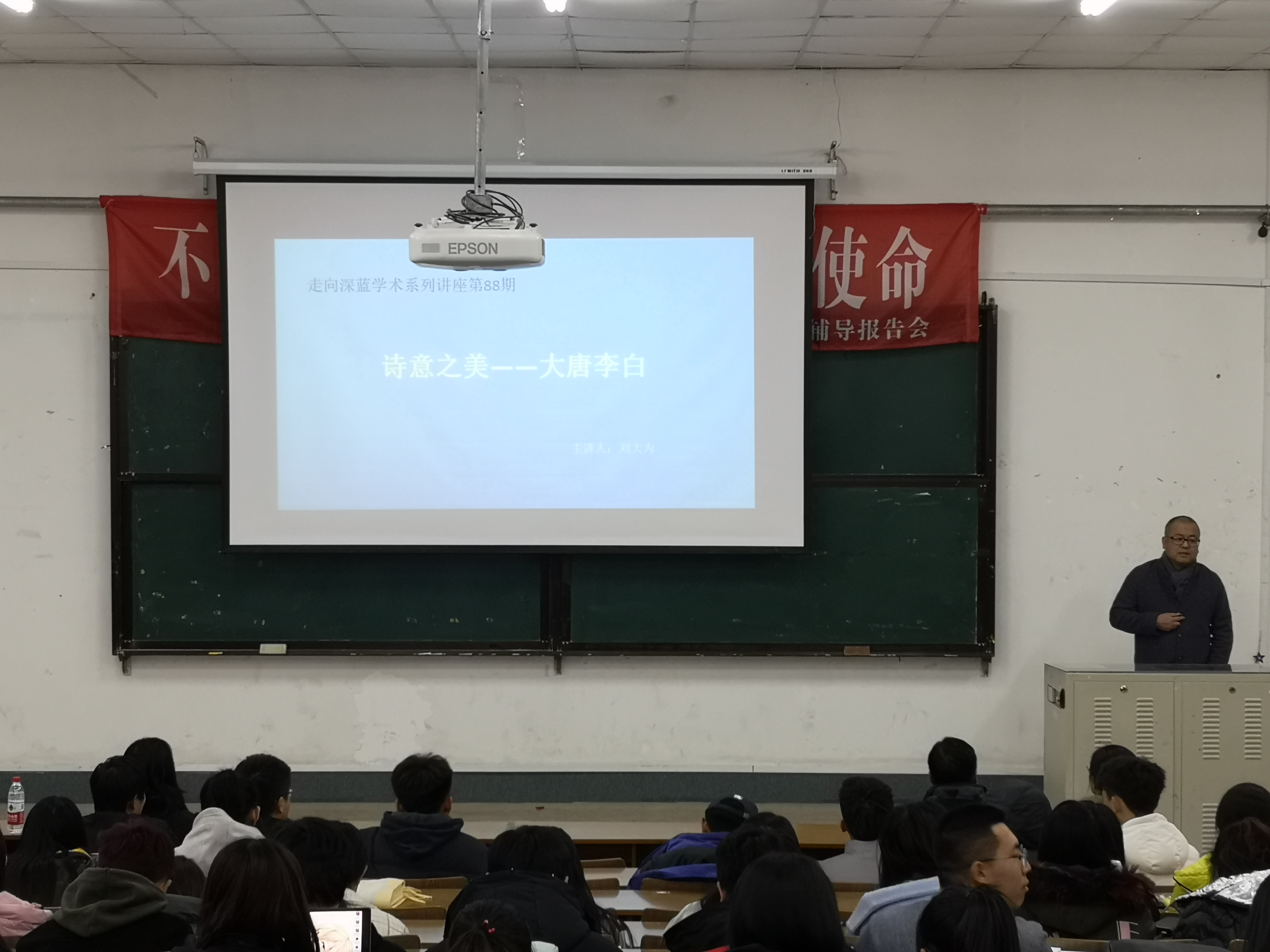11月28日下午,365英国上市公司在阶梯一教室开展了第101期“走向深蓝”学术系列讲座。本次讲座邀请到了辽宁师范大学影视公司研究生导师刘大为老师担任主讲,讲座主题为“诗意之美——大唐李白”。365英国上市公司全体18级本科员工及部分老师参加讲座。