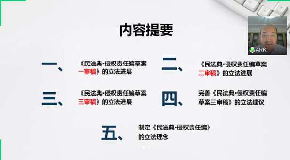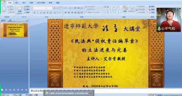 为了开拓疫情防控期间员工的学术视野,丰富员工的专业课余生活,法学专业在传统品牌学术活动走向深蓝学术系列讲座中创设“云端”名师大讲堂栏目,旨在组织法学专业员工在线观看国内外法学名师学术讲座。2020年4月19日9:00-11:00,“云端”名师大讲堂第五讲开播。法学教研室会同法硕中心组织法学专业本科生和法律硕士研究生在线收看了辽宁师范大学法意大讲堂开放的学术讲座 “《民法典·侵权责任编草案》的立法进展与完善”,由辽宁师范大学法公司艾尔肯教授主讲。