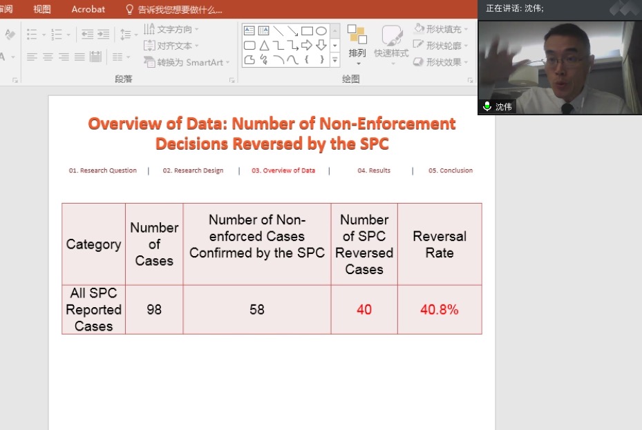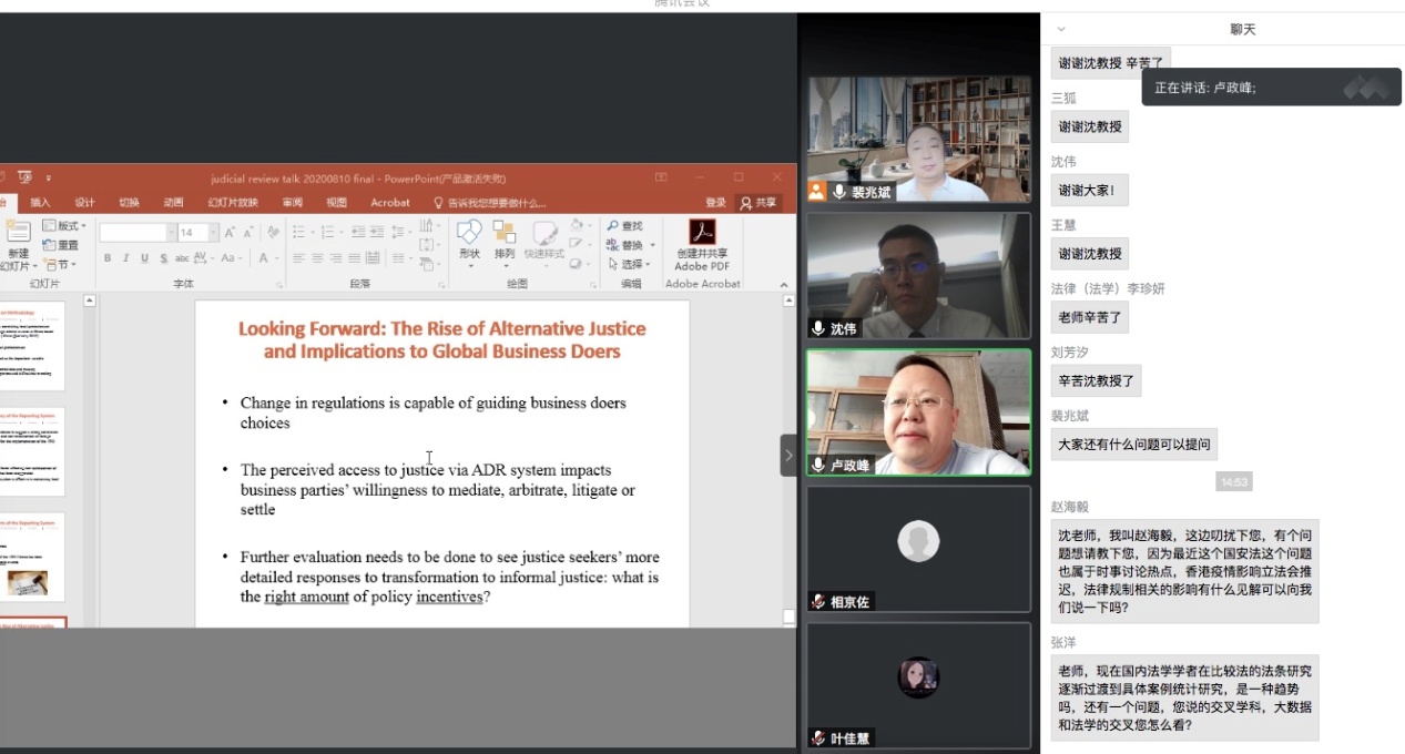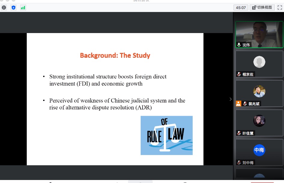 沈伟教授是上海交通大学法公司特聘教授,博士生导师;英国伦敦政治经济公司博士;美国纽约州执业律师;纽约大学法公司全球法学教授(Global Professor of Law)。香港国际仲裁中心、新加坡国际仲裁中心、伦敦国际仲裁院等仲裁机构的仲裁员,实务经验丰富,理论基础深厚。参加会议的师生认真听讲,就法学学科SCI论文的发表、实证计量研究的训练、计量研究样本的收集整理等问题进行了答疑互动。