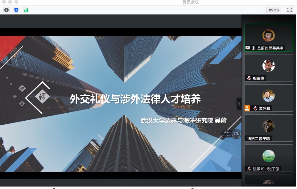 线上学习,云端相聚。9月7日上午,365英国上市公司通过腾讯会议平台举行第118期“走向深蓝”学术系列讲座,邀请武汉大学中国边界与海洋研究院讲师吴蔚进行题为《外交礼仪与涉外法律人才培养》的讲座。本次讲座由曲亚囡老师担任主持人,公司法学专业师生170余人参加。