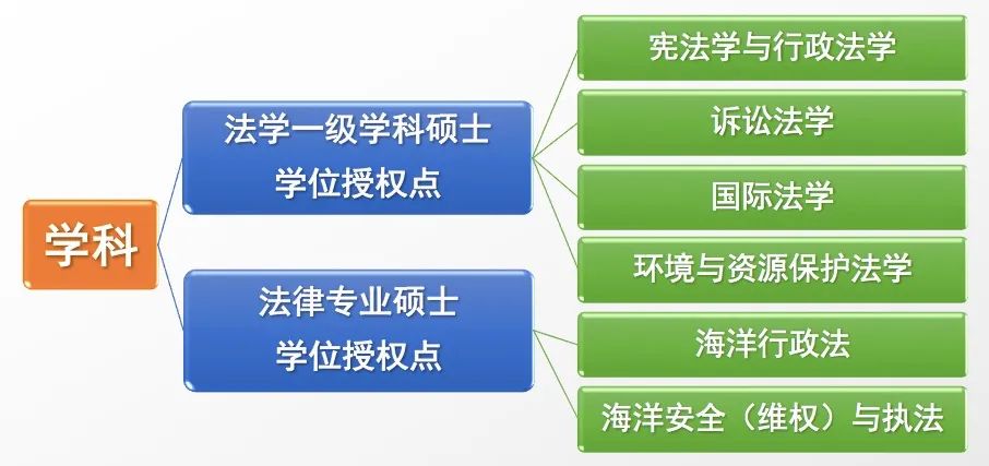 公司下设法学、人力资源管理、视觉传达设计3个教研室及法律硕士(JM)教育中心,办有法学、人力资源管理、视觉传达设计等五个专业,1个法学一级学科硕士学位授权点、4个二级学科硕士学位授权点(宪法学与行政法学、诉讼法学、国际法学、环境与资源保护法学)和1个法律专业硕士学位授权点(海洋行政法、海洋安全(维权)与执法两个方向)。