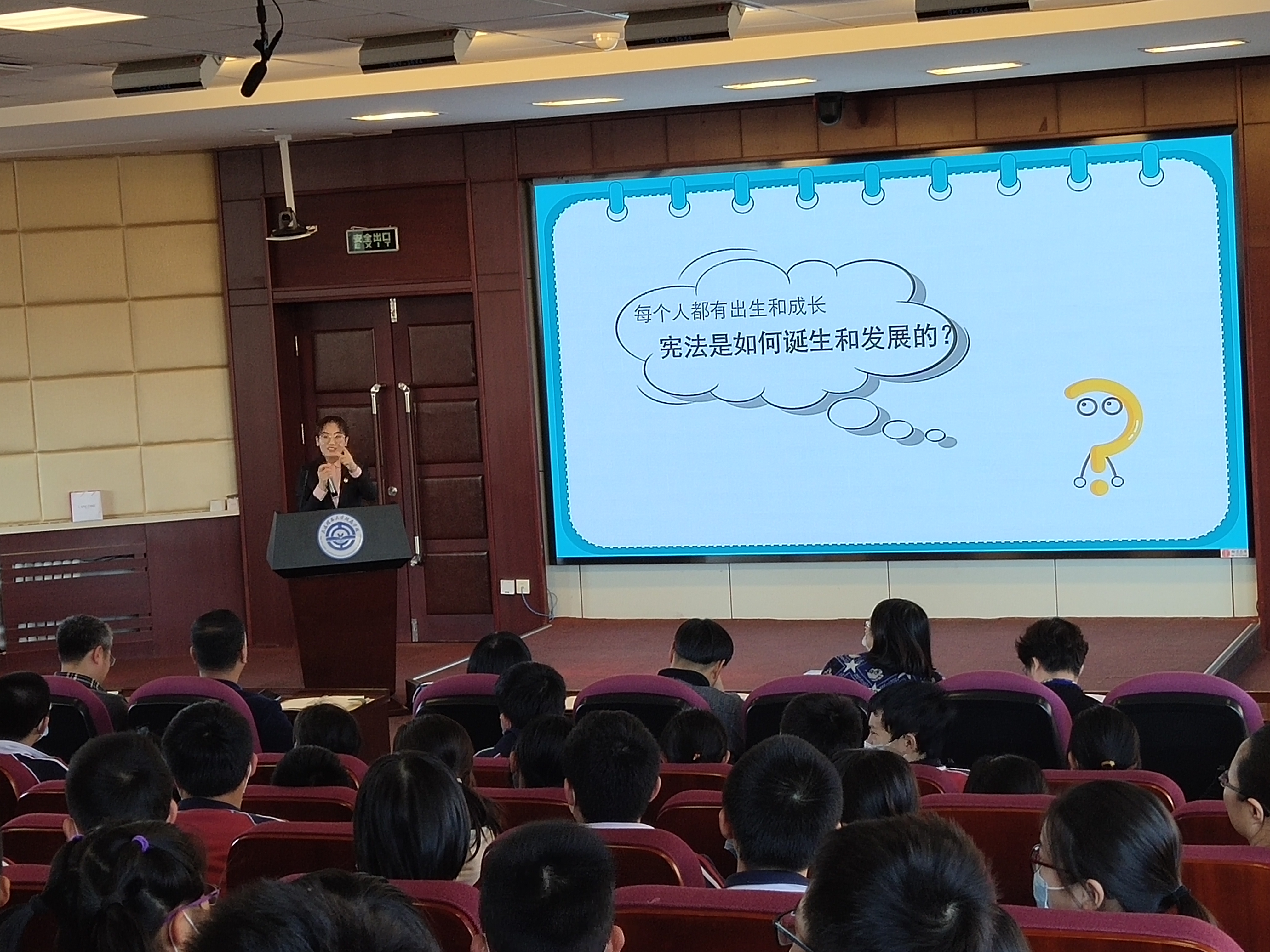 此次普法宣传活动由研究生支部党员姜沫彤主持。支部党员李瑞卿分别从“宪法是什么?宪法是怎样诞生和发展的?宪法与我有什么关系?我们应该怎么做?”四个方面为在座的七年级员工进行了一场精彩的讲座,用生动活泼的语言为刚刚步入初中的同学们讲述了宪法的基础知识,并通过知识竞答的方式与同学们进行了互动,同学们都积极踊跃的回答问题,他们勇敢自信的表现获得了现场阵阵掌声。同学们在交流和互动中加强了对宪法知识的掌握。