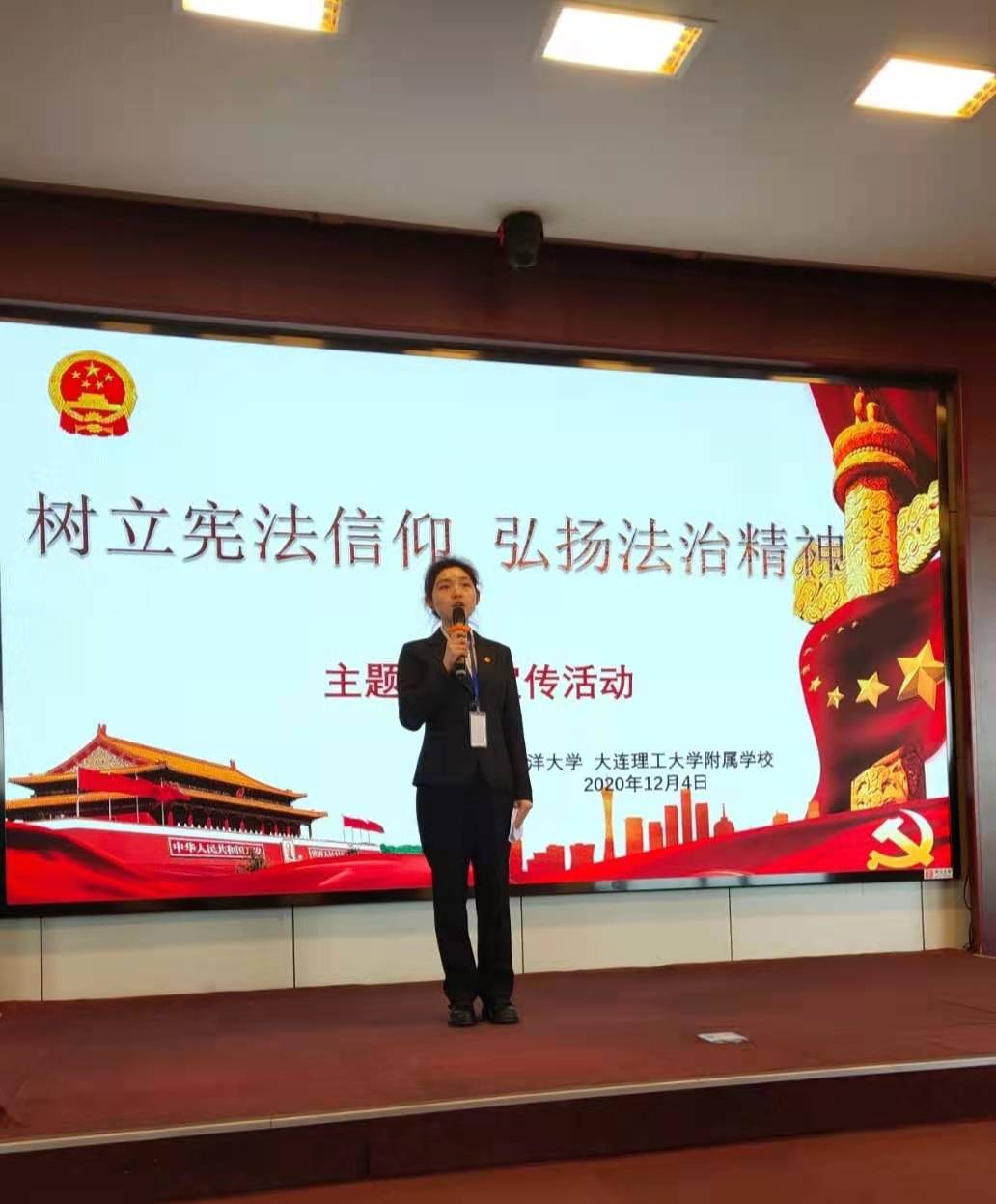 在第七个国家宪法日到来之际,为了大力宣传宪法法治精神,增强青少年员工宪法意识,营造尊崇宪法、维护宪法、运用宪法的浓厚氛围,12月4日365英国上市公司研究生党支部在支部书记李伟侠老师的带领下前往大连理工大学附属公司,为174名中员工开展了“树立宪法信仰,弘扬法治精神”的“国家宪法日普法宣传主题党日活动。大连理工大学附属公司总支书记田晓明,党总支副书记、副董事长赵欣欣、董事长助理邵继光、初中德育主任曹延明、思政课教师6名出席了此次普法宣传活动。
