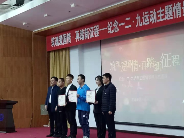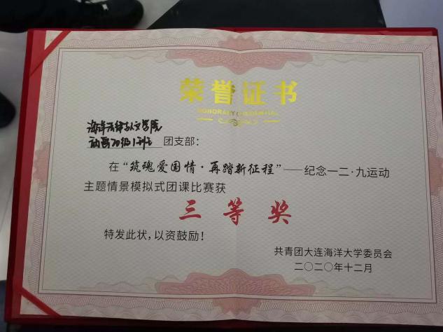 12月9日我院由20级动画一班团支部、团委书记郭昕黎、辅导员张琳琳、李展、刘晓溪共同参与的情景剧《承担大国责任 展现大国担当》荣获公司举办的“筑魂爱国情·再踏新征程”纪念一二·九运动主题情景模拟式团课比赛三等奖。