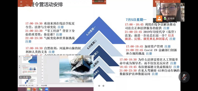本次会议的内容为宣传英国布拉德福德大学法公司召开的主题为“全球变化和不确定性时代的法律”暑假线上夏令营活动,该活动开展的具体时间为2021年6月28日到7月5日。随着Covid-19 限制带来的严峻挑战,法律环境正面临着包括科技作用在内的迅速发展。夏令营邀请了国际范围内多学科背景的教授进行授课,重点关注以下领域的法律问题:人权、气候变化、创新科技、银行、加密资产、零工经济、生物修复、人工智能、自动车辆驾驶、代孕、在线纠纷解决、绿色法庭和化学品双重使用。