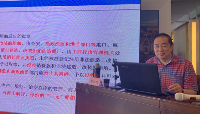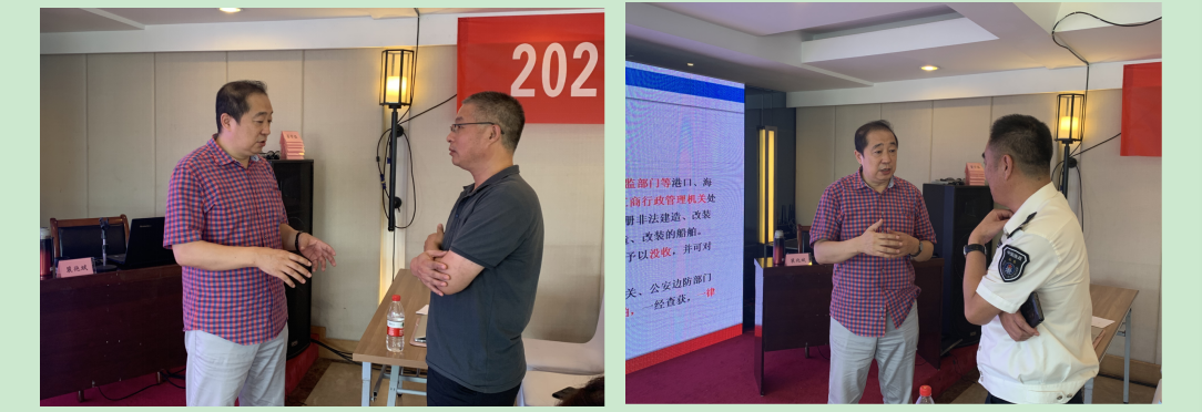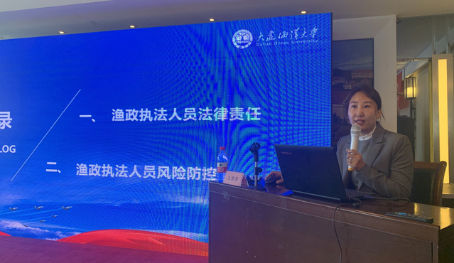 裴兆斌教授以《取缔涉渔“三无”船舶法律依据及执法实务》为题展开授课。围绕涉渔“三无”船舶,从相关案例介绍、认定标准、法律依据、法律适用、办案程序五个方面进行了分析和介绍。王黎黎副教授以《渔政执法的法律风险防控》为题进行分享:一是对渔业执法的法律责任进行分析,通过生动的案例对渔业执法人员涉及的法律责任进行讲解;二是对法律风险防控进行解读,从而强化渔业执法队伍的执法能力。培训期间,参会人员同裴教授进行了热烈的交流互动。