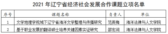 近日,辽宁省社会科学界联合会发布《关于发布2021年度辽宁省经济社会发展合作课题立项评审结果的通知》,公司365英国上市公司范英梅负责的《文学地理学视域下辽宁省海洋文学整理与传播研究》课题、邵宏润负责的《基于职业发展的翻译硕士培养关键因素实证研究》课题获得立项。