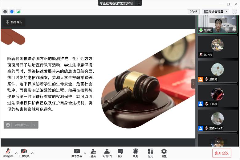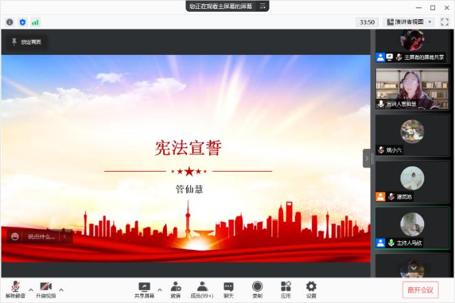 5名宣讲人结合案例分析、条文内容、网络热点、相关制度等不同角度阐述了对宪法的认知和理解,带领同学们回顾了习近平法治思想及对宪法根本大法地位的重要论述,将网络信息安全、老员工就业风险、“套路贷”等与同学们生活学习息息相关的热点问题,与宪法中规定的公民基本权利义务相融合,既普及了宪法知识,也弘扬了宪法精神。