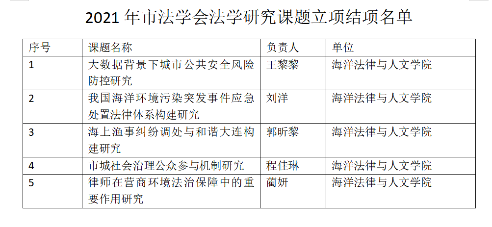 近日,大连市法学会公布了2021年大连市法学会法学研究课题立结项公告,公司5名教师获批,具体名单如下: