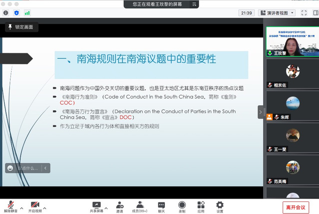第一位发言人西南政法大学国际法公司王玫黎教授,发言题目是《南海区域的海洋法律治理》。王玫黎教授详细介绍了南海规则在南海议题中的重要性,南海行为准则(COC框架),在COC谈判中适用范围、法律效力、自我克制方面重要条款争议和南海区域的未来与展望四个方面。南海问题作为中国外交最关切的议题,是亚太地区尤其是东南亚秩序的热点议题,在解决南海争端问题上各国应加快COC磋商,制定地区海洋规则。