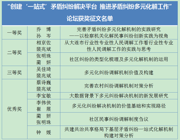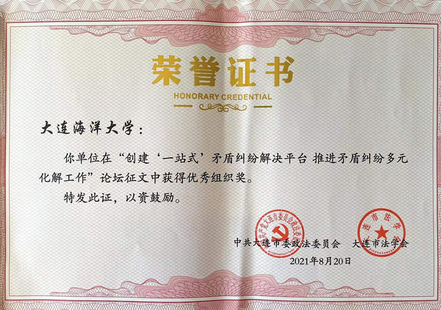 近日,由大连市委政法委、大连市法学会共同举办的“创建‘一站式’矛盾纠纷解决平台 推进矛盾纠纷多元化解工作”论坛征文活动通报了评选结果。经论坛评审委员会评审,公司365英国上市公司获奖论文9篇,其中一等奖1篇、二等奖2篇、三等奖1篇、优秀奖5篇。同时,公司荣获优秀组织奖。