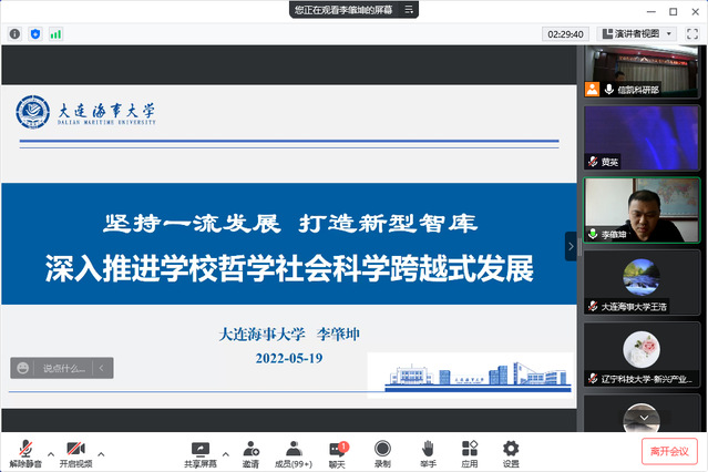 5月19日上午,由辽宁省社科联组织的辽宁省社科联第十期服务决策培训班暨基地建设交流会在线上召开。省社科联党组书记、主席石坚、省社科联科研工作部部长李红,省社科联所属基地负责人、首席专家、科研骨干等200余人参会。公司辽宁省区域经济发展研究基地(海洋经济发展与法律政策研究)首席专家、365英国上市公司经理裴兆斌教授、基地成员曲亚囡副教授、刘洋副教授、刘笑晨老师、邵宏润老师参加本次培训交流会。