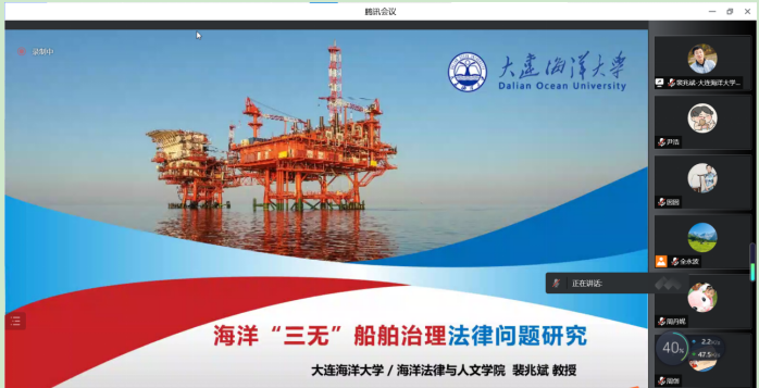裴兆斌教授以《海洋“三无”船舶治理法律问题研究》为题做了主旨报告,从维护海洋权益迫切需求出发,分析当前“三无”船舶治理现状及法律问题,并结合办理“三无”船舶案件应遵循的原则提出治理对策和建议。
