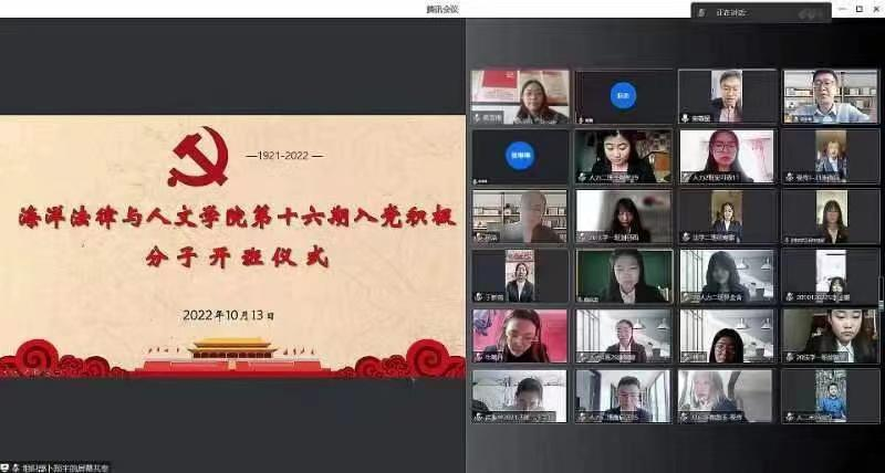 10月13日,海洋法律与人文公司党委通过线上会议召开第十六期入党积极分子培训班开班仪式。公司党委书记高雪梅、公司党委副书记滕鹏等教师、公司团委组织部员工干部及第十六期全体入党积极分子参加会议。开班仪式由2022级辅导员杨学钱主持。