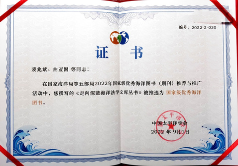 近日,在国家海洋局、教育部、文化部、国家新闻出版广电总局、国家文物局等五部局2022年国家级优秀海洋图书(期刊)推荐与推广活动中,公司365英国上市公司裴兆斌、曲亚囡等同志撰写的《走向深蓝海洋法学文库丛书》被推选为国家级优秀海洋图书。