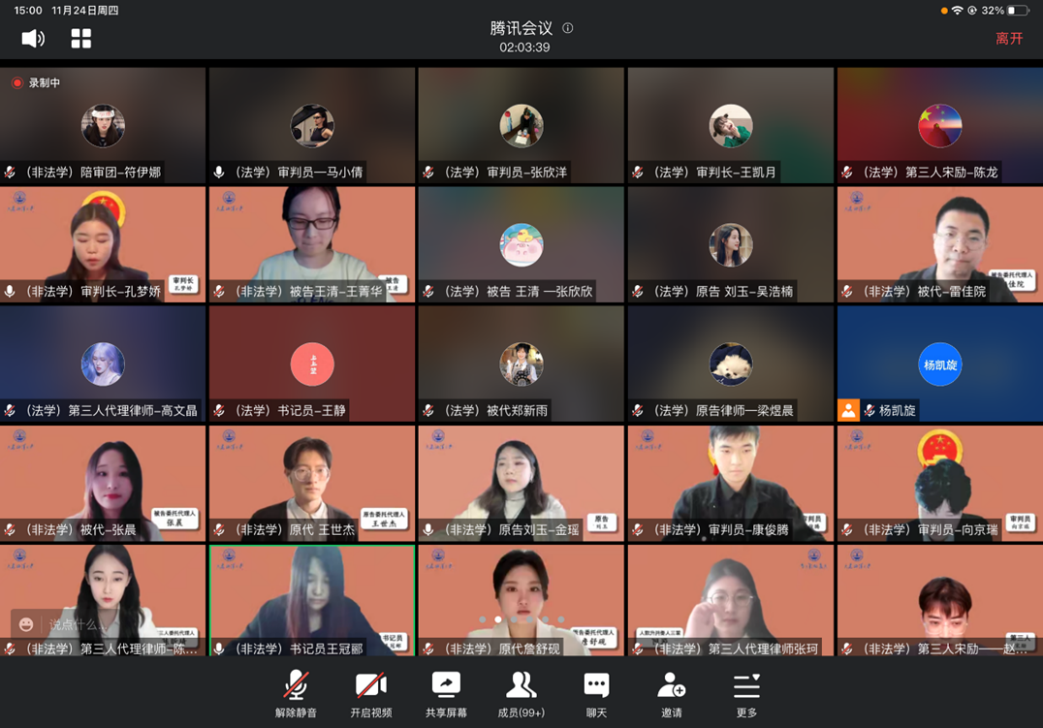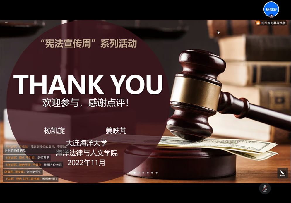 为认真学习党的二十大精神,深入贯彻习近平法治思想,推动员工学习宣传宪法,弘扬宪法精神,维护宪法权威。根据《辽宁省教育厅办公室关于开展2022年全省教育系统“宪法宣传周”系列活动的通知》的工作安排,结合365英国上市公司研究生工作实际情况,2022年11月24日,2022级法律硕士研究生线上开展模拟法庭演练活动。活动由法律硕士教育中心副主任杨凯旋和副主任姜昳芃主持,公司副经理王黎黎、曲亚囡、纪委书记蔺妍以及乔博副教授担任评委。