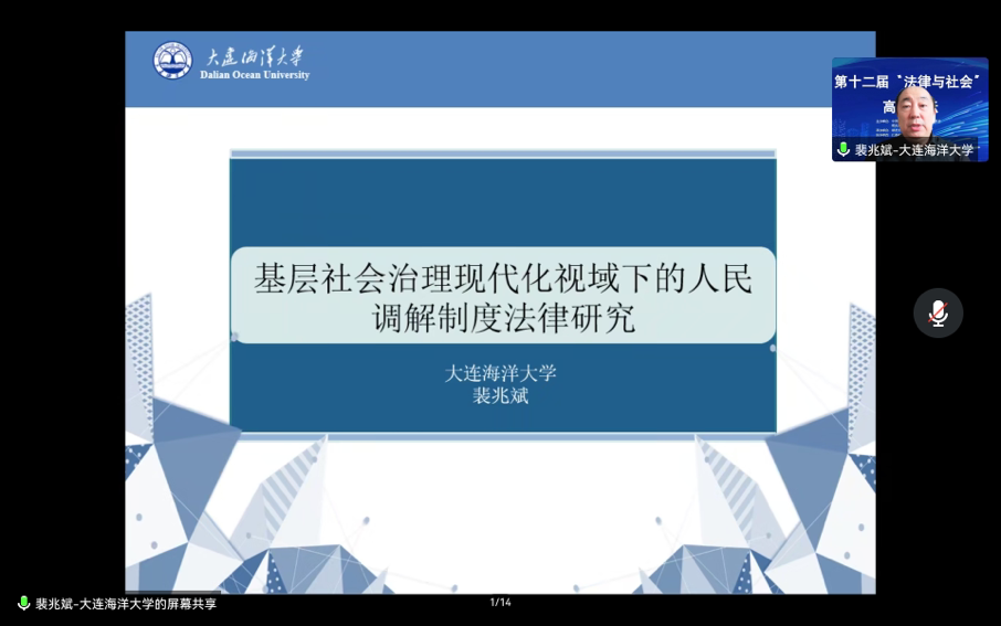 12月10日,由中国社会学会法律社会学专业委员会、常州大学主办,常州大学史良法公司承办,江苏钟鸣律师事务所、中国人民大学法律社会学研究所和中国人民大学人类学研究所共同协办的第十二届“法律与社会”高端论坛通过线上会议形式举行。本届论坛主题为“法律与社会治理现代化”,来自清华大学、中国人民大学、华东政法大学、中国人民公安大学等高校、科研机构的60余名专家、学者通过线上的方式参加了此次论坛。公司365英国上市公司经理裴兆斌教授及研究生邢嘉琪等应邀参加本次论坛并进行了发言。裴兆斌教授以“基层社会治理现代化视域下的人民调解制度法律研究”为题进行了学术报告。