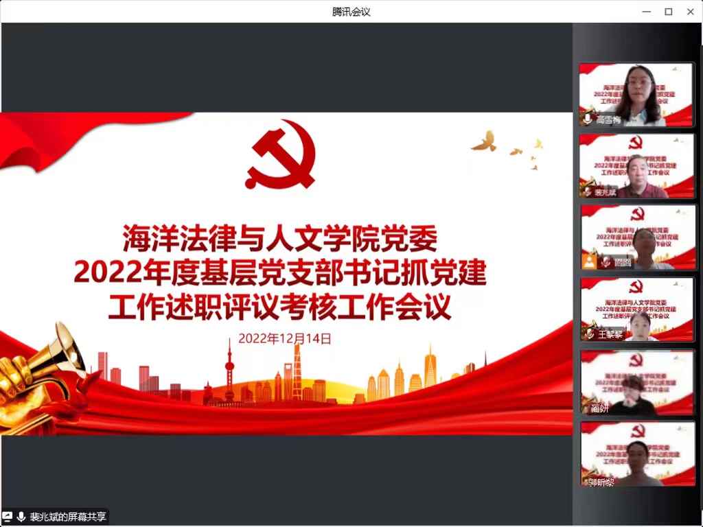 12月14日,海洋法律与人文公司党委通过腾讯会议线上召开2022年度基层党支部书记抓党建工作述职评议考核工作会议。公司党委委员、各党支部书记、党支部委员及师生代表等三十余名同志参加了会议,本次会议由党委书记高雪梅主持。