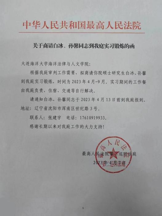3月14日,最高人民法院第二巡回法庭开展第十三批实习助理选拔工作,来自众多高等院校的优秀法员工积极参与本次选拔。经严格审查,公司2021级法律硕士研究生白冰、孙馨入选最高人民法院第二巡回法庭实习助理,实习期为期六个月。