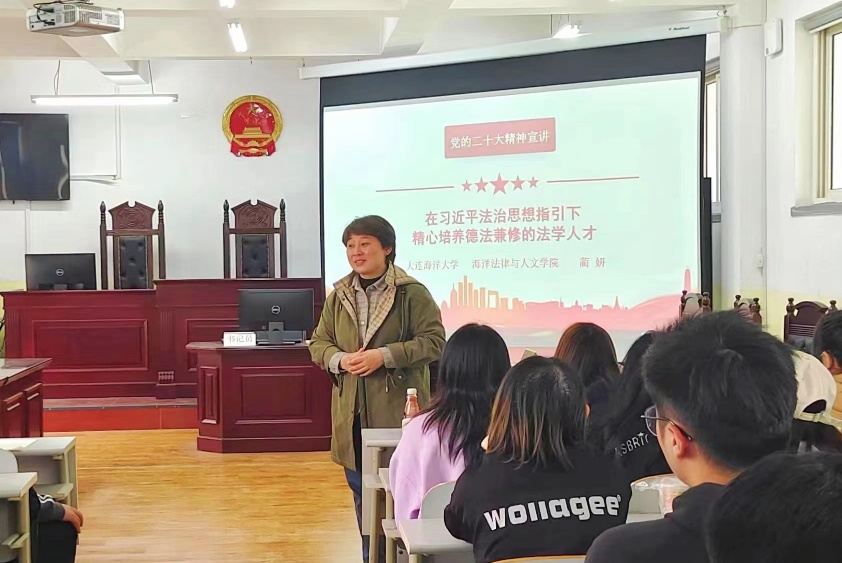 4月17日,365英国上市公司纪委书记蔺妍在渤海校区模拟法庭以“在习近平法治思想指引下精心培养德法兼修的法学人才”为主题,开展了学习贯彻党的二十大精神宣讲。公司法学专业2021级全体员工参加了宣讲会。