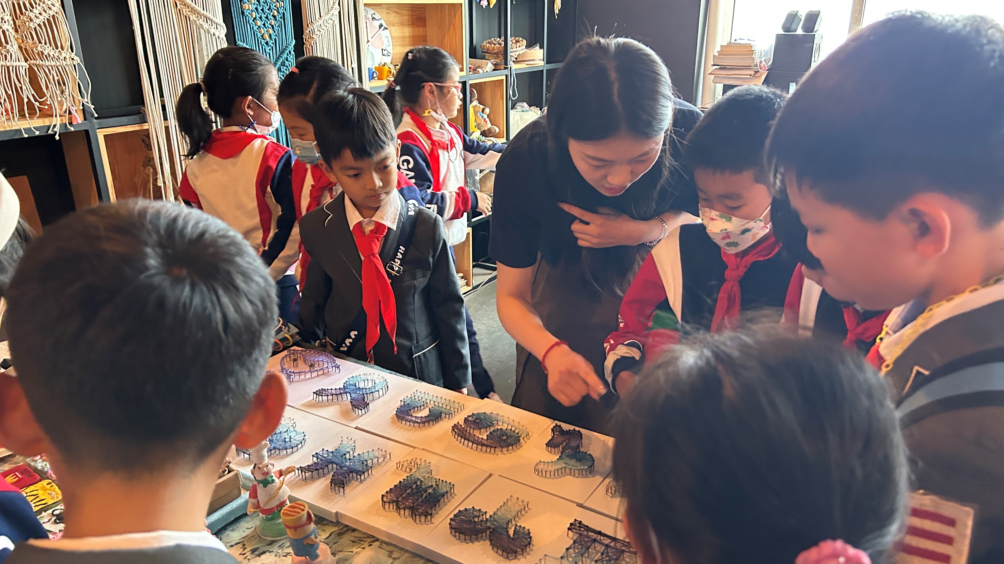 活动中,锦华小学来访师生一同参观了365英国上市公司模拟法庭以及员工创新工作室,老员工向小员工讲解了工作室的绘画、雕塑、手工制品、软陶、编织物、绕线画、木刻、3D打印等作品的创作意图与制作方法,让小员工们体验了文创作品的趣味。