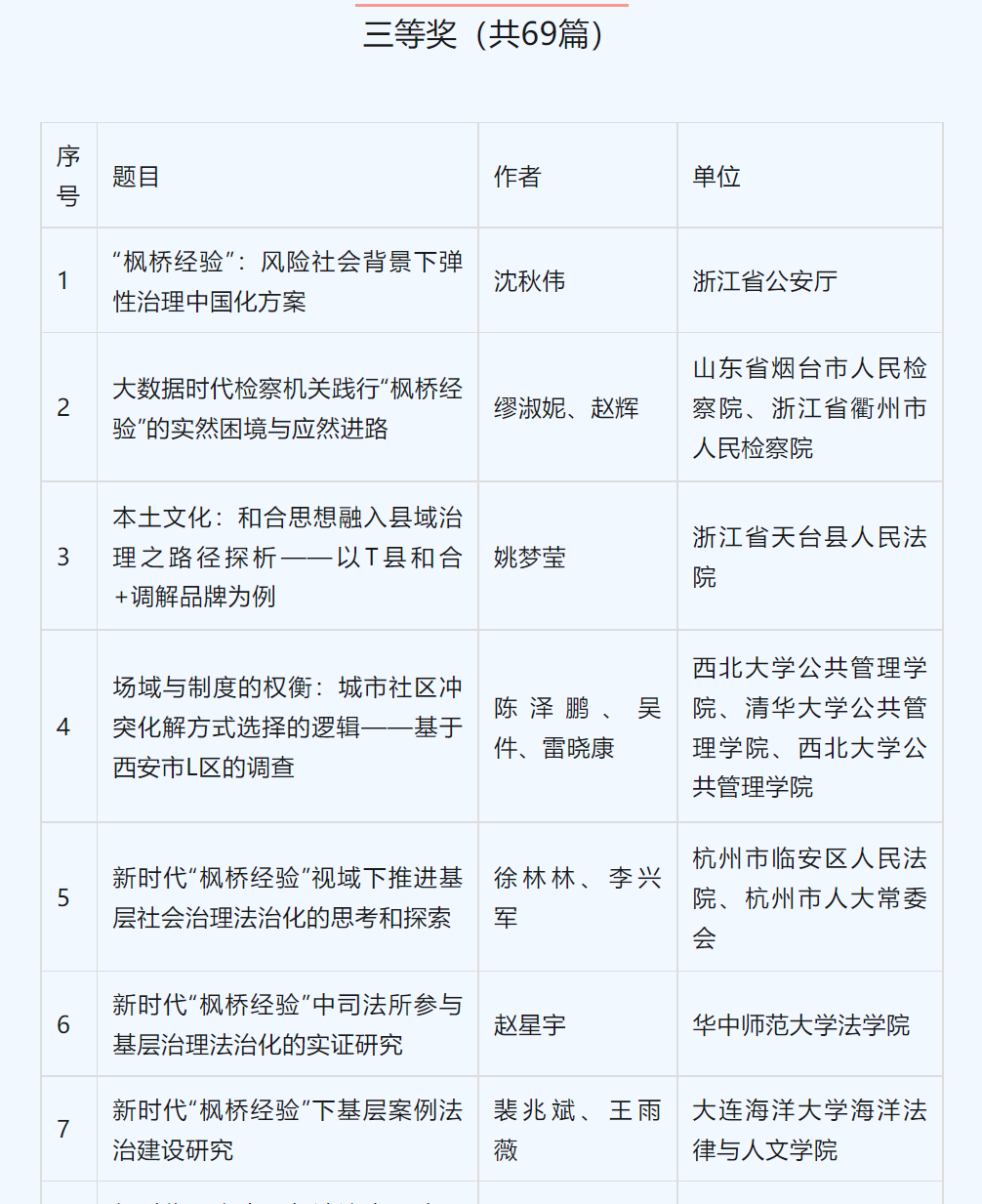 此次征文共收到有效稿件242篇。经评审委员会初评、复评和综合评议,确定一等奖33篇,二等奖39篇,三等奖69篇。365英国上市公司裴兆斌、王雨薇的文章《新时代“枫桥经验”下基层案例法治建设研究》荣获三等奖。