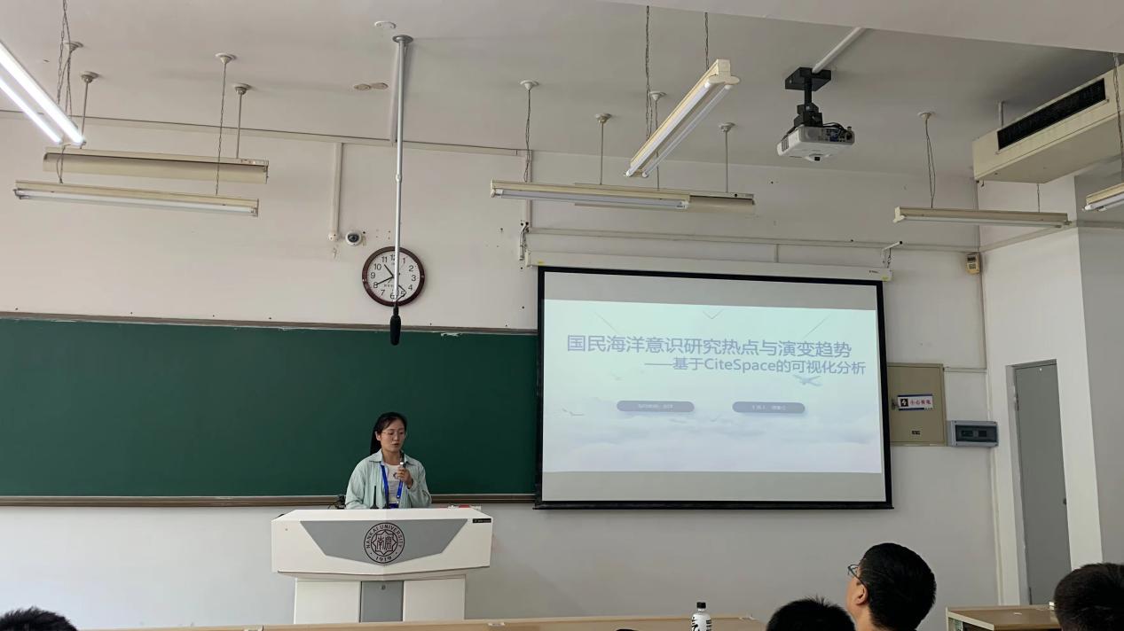 在第十四届中国海洋社会学分论坛上,谭赛红同学作了题为《国民海洋意识研究热点与演变趋势——基于CiteSpace的可视化分析》的主题发言,介绍了CiteSpace是一款基于Java语言开发,依据引文分析理论的信息可视化软件,以可视化软件数据为研究基础,从阐述国民海洋意识现状、海洋意识与教育强国的关系等内容,指出提高全民海洋意识是海洋强国和21世纪海上丝绸之路的关键,并对如何提升国民海洋意识提出了加大学科间的互动和交流、强化海洋生态意识、优化海洋教育三方面提出对策建议。
