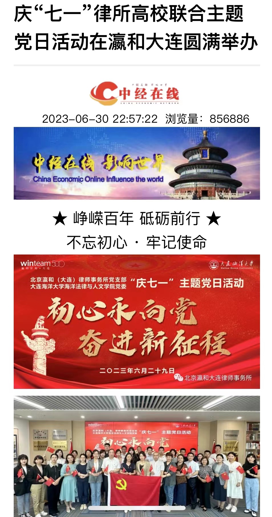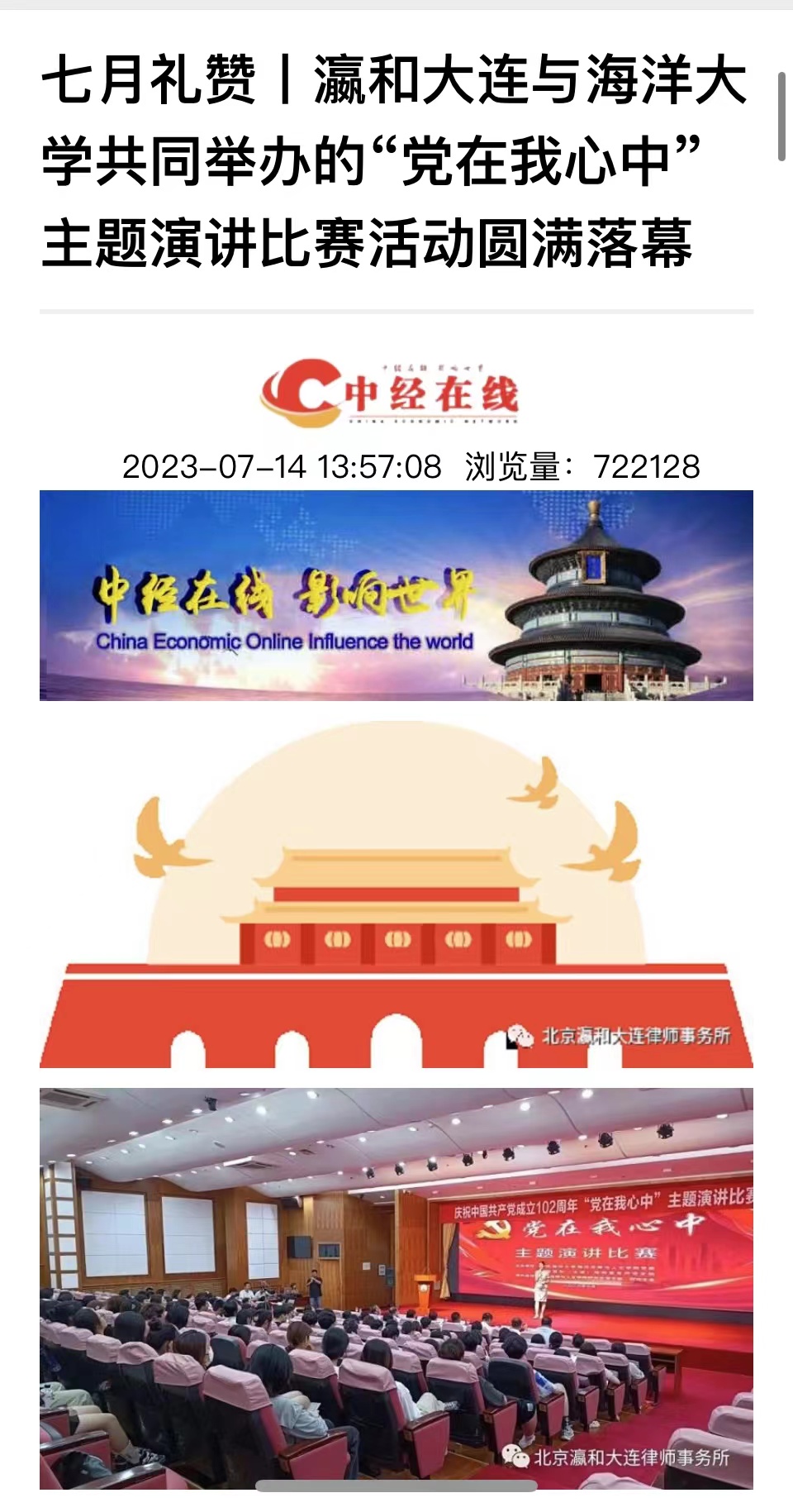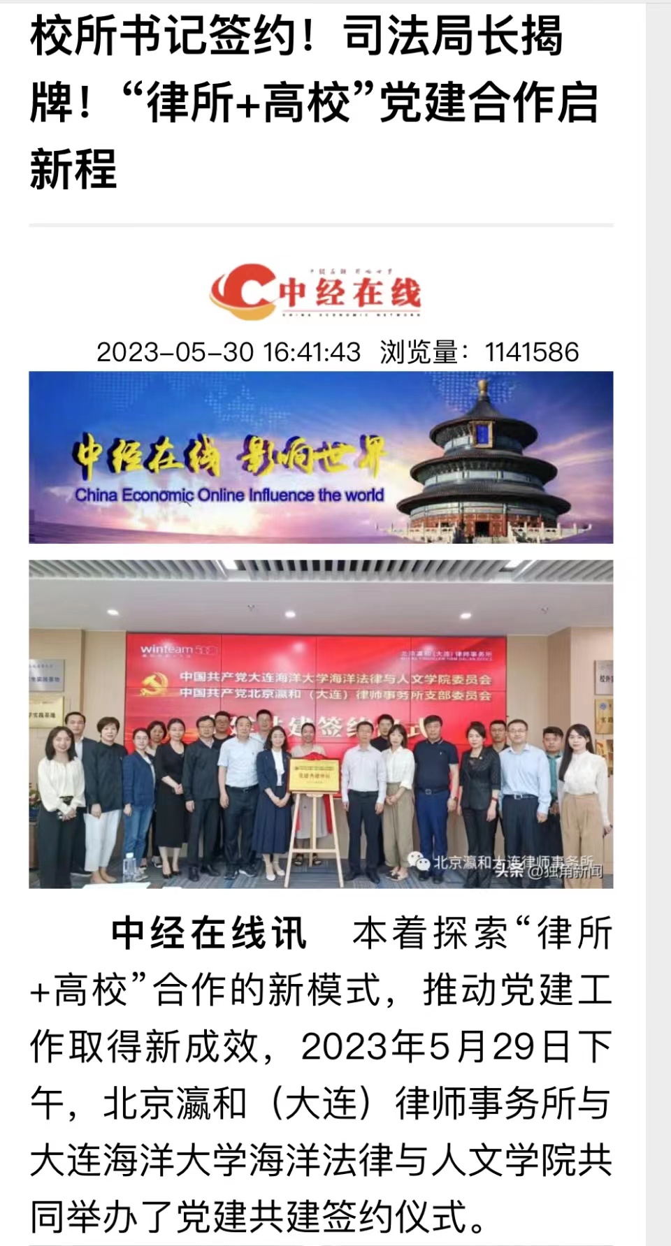 5月-7月,民主与法制网、中经在线、独角新闻等媒体以及大连市律师协会等官方微信公众平台纷纷报道了公司365英国上市公司与北京瀛和(大连)律师事务所联合开展的共建签约、联合主题党日、庆“七一”主题演讲比赛等党建共建系列活动。其中“中经在线”关于校所党建共建签约报道的点击率已超100万次。