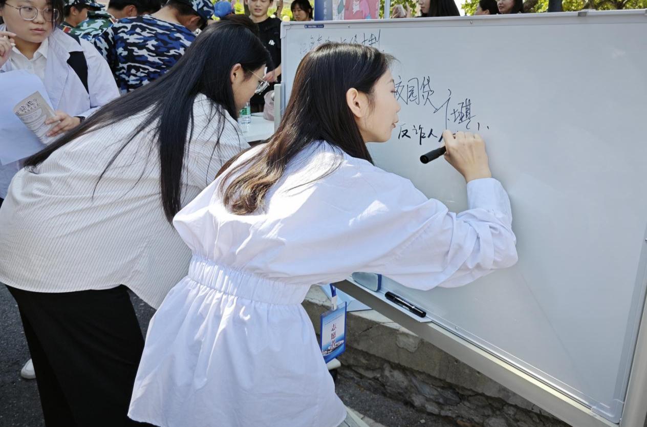 本次校内“反诈”宣传主题为“你我同心、反诈同行”,活动围绕提高员工的“反诈”意识和“反诈”能力,开展了发放宣传单、有奖答题、主题签名以及校园随机采访等活动。