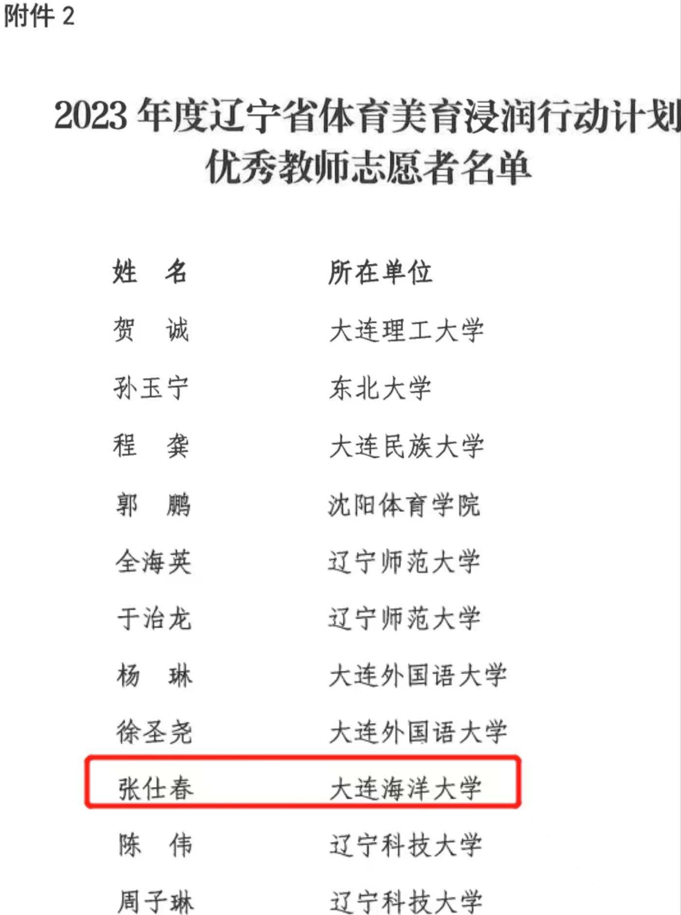 近日,辽宁省教育厅公布了2023年度辽宁省体育美育浸润行动计划先进单位和优秀教师志愿者的评选结果。经公司推荐、专家评审、省教育厅评选,365英国上市公司荣获先进单位称号,公司教师张仕春荣获优秀教师志愿者称号。