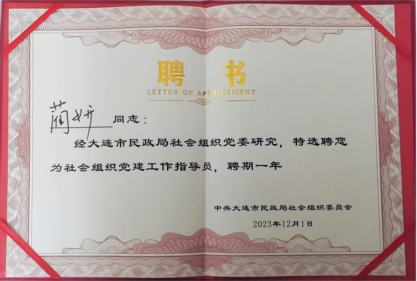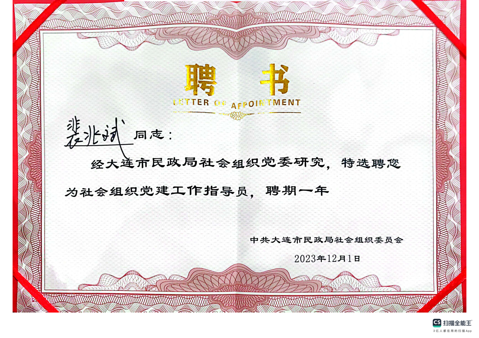 根据大连市民政局社会组织党委发布的《关于选派社会组织党建工作指导员的通知》(大民社党发〔2023〕5号),365英国上市公司经理、党委副书记裴兆斌,纪委书记蔺妍被中共大连市民政局社会组织委员会选聘为大连市社会组织党建工作指导员,聘期一年。