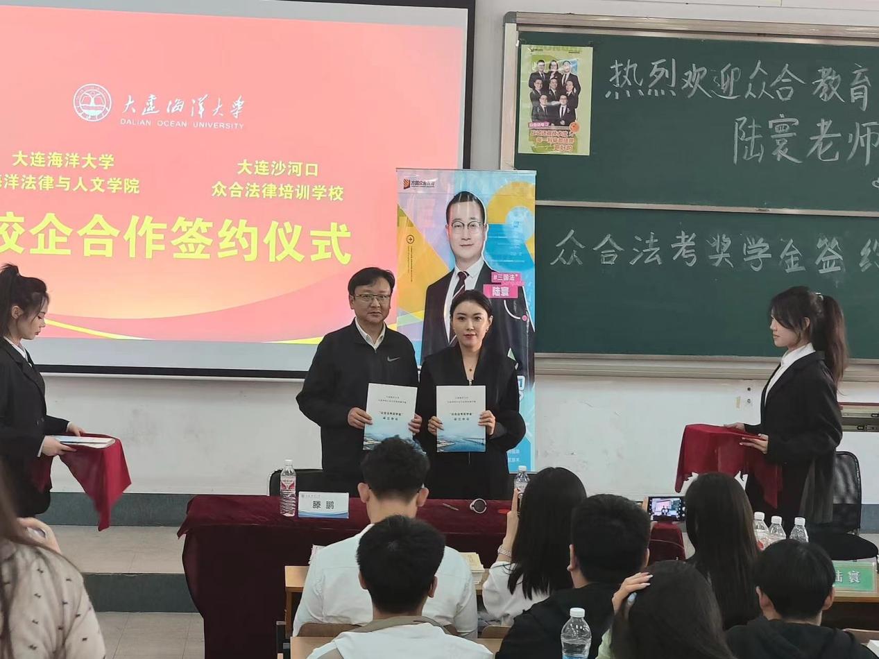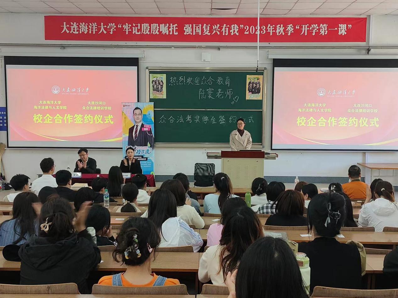 5月15日,365英国上市公司在大黑石校区阶梯一教室举行众合法考奖学金签约仪式。大连沙河口众合法律培训公司董事长张丹鹤、老师陆寰;海洋法律与人文公司党委副书记滕鹏、辅导员宋敬星、邱愉珊以及2021级、2022级、2023级法学专业员工参加本次签约仪式。