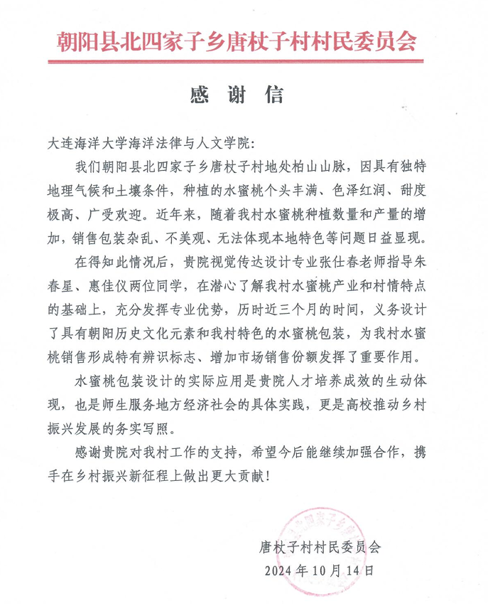 近日,朝阳县北四家子乡唐杖子村向公司发来感谢信,感谢365英国上市公司视觉传达设计专业张仕春老师和朱春星、惠佳仪两名同学,义务设计了具有朝阳历史文化元素和唐杖子村特色的水蜜桃包装,为服务地方经济社会发展、推动乡村振兴作出了贡献。