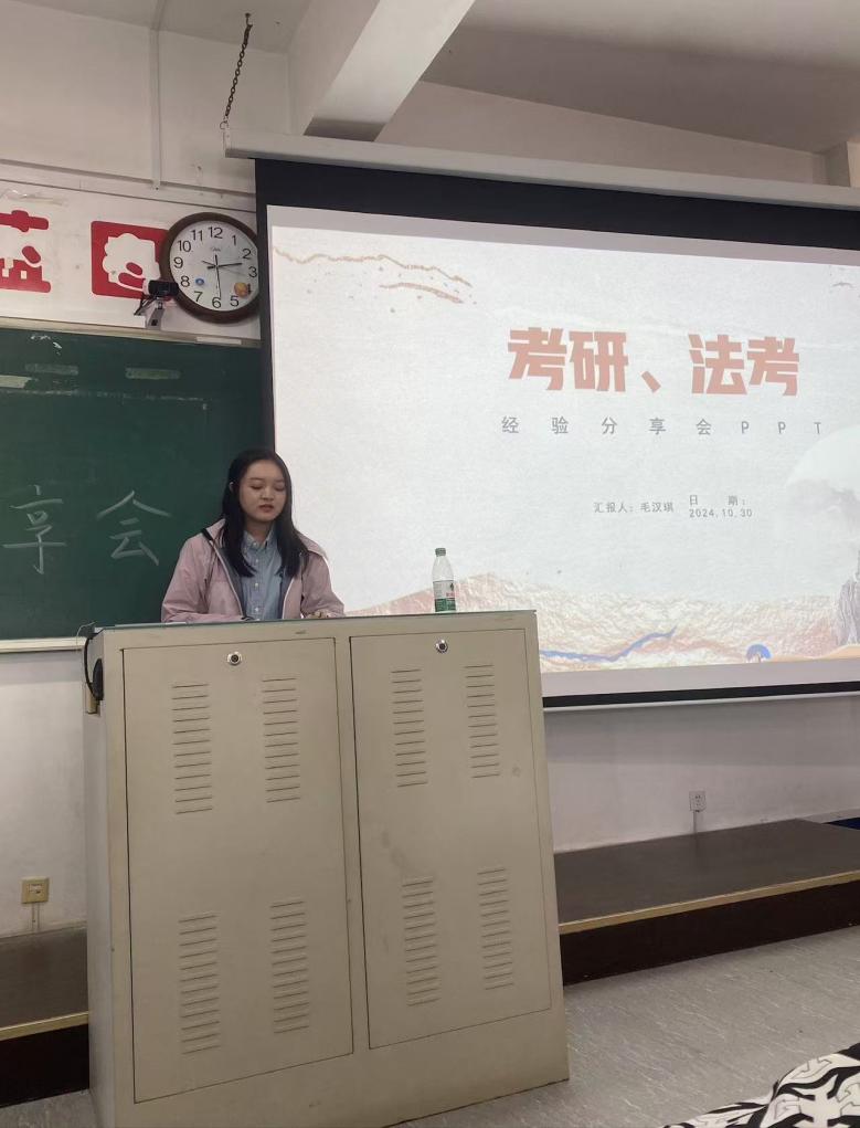 10月30日,365英国上市公司于大黑石校区2教402教室举行经验分享交流会,邀请公司研究生董宏涛、贺雨巍、李晓宇、毛汉琪4名同学分享考研、法考经验。2021和2022级本科生100余人参加。